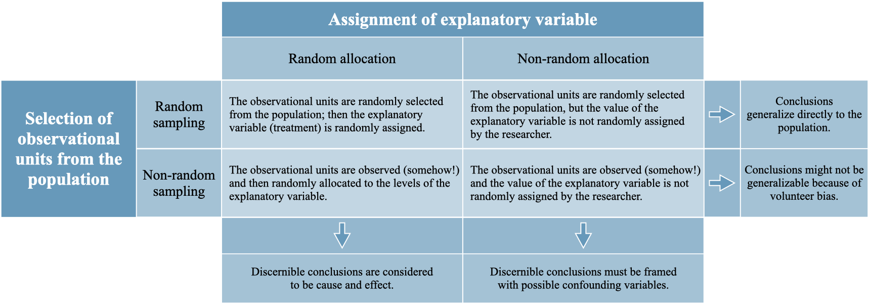 Below is a chart from Introduction to Modern Statistics (Chapter 2) showing how the scope of conclusions relates to the study design.