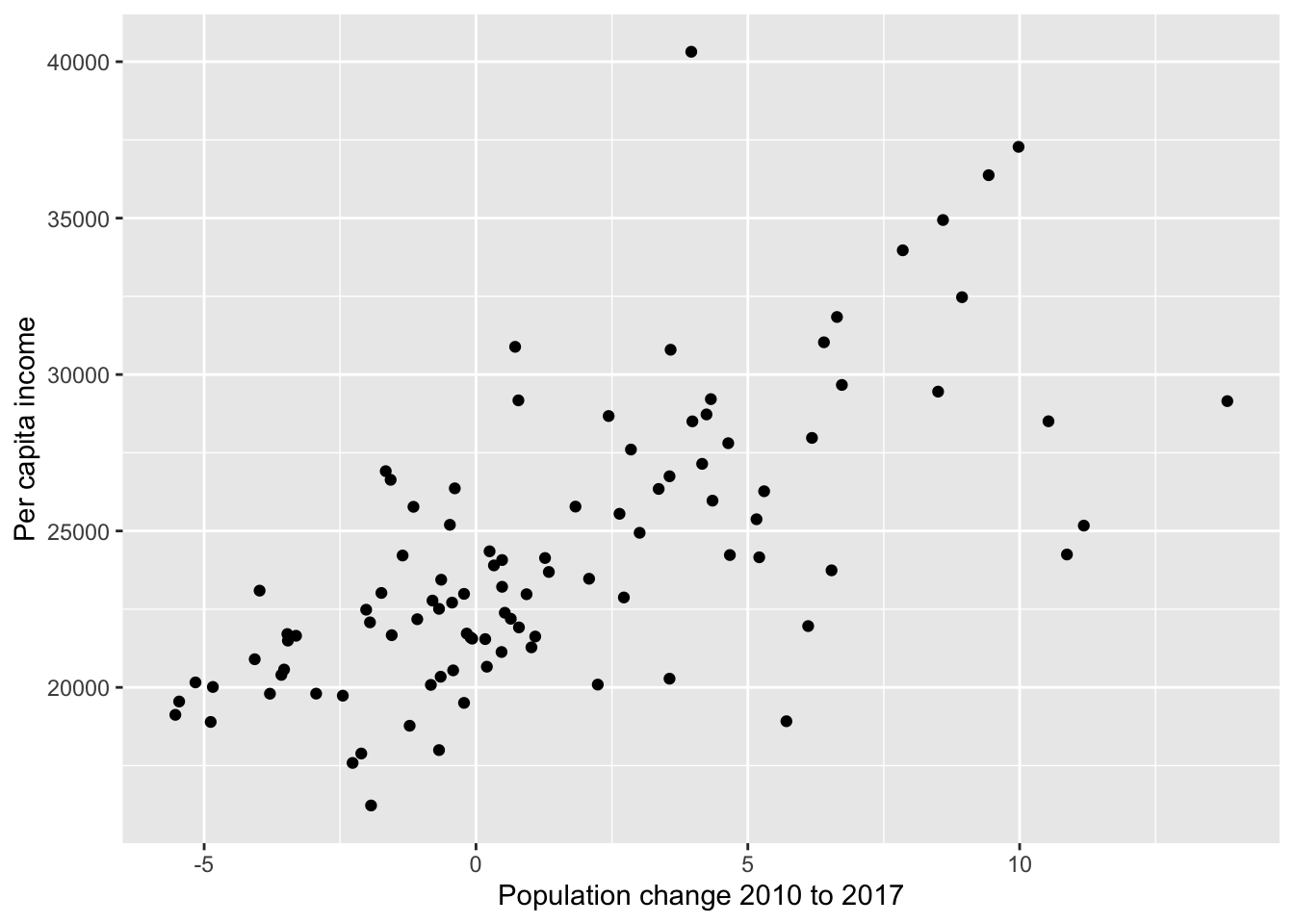 Below is graph of the relationship between population change from 2010 to 2017 and per capita (per person) income.