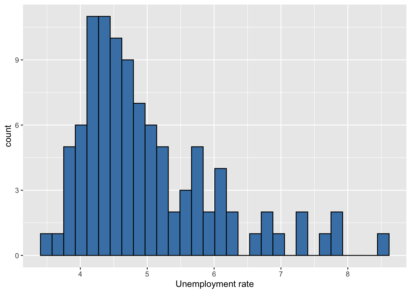 We will use data about the 100 counties in North Carolina. The data were collected from the from Census Quick Facts and is available in the usdata R package. Let’s look at the first 10 rows of data.