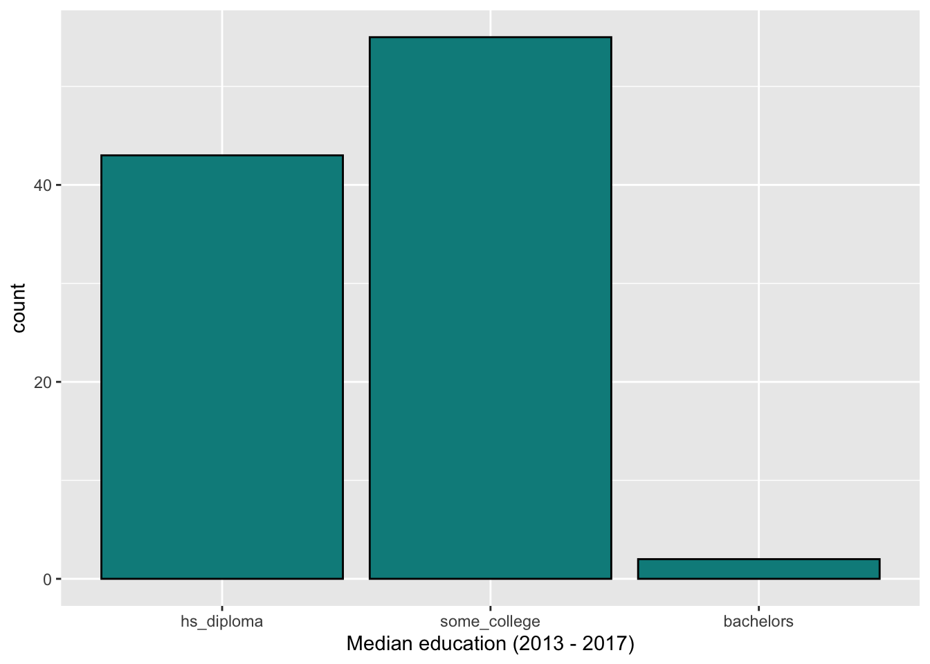 Below is a bar chart and frequency table showing the distribution of median_edu, the median education level (2013 - 2017):